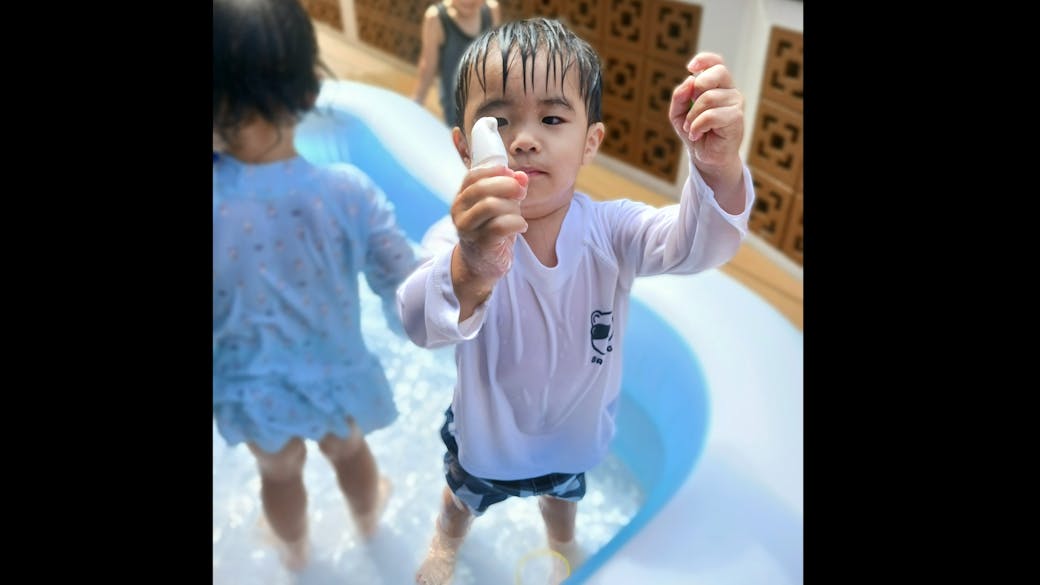 夏にはお友達とスイカ割りやそうめん流し、園庭での水遊び